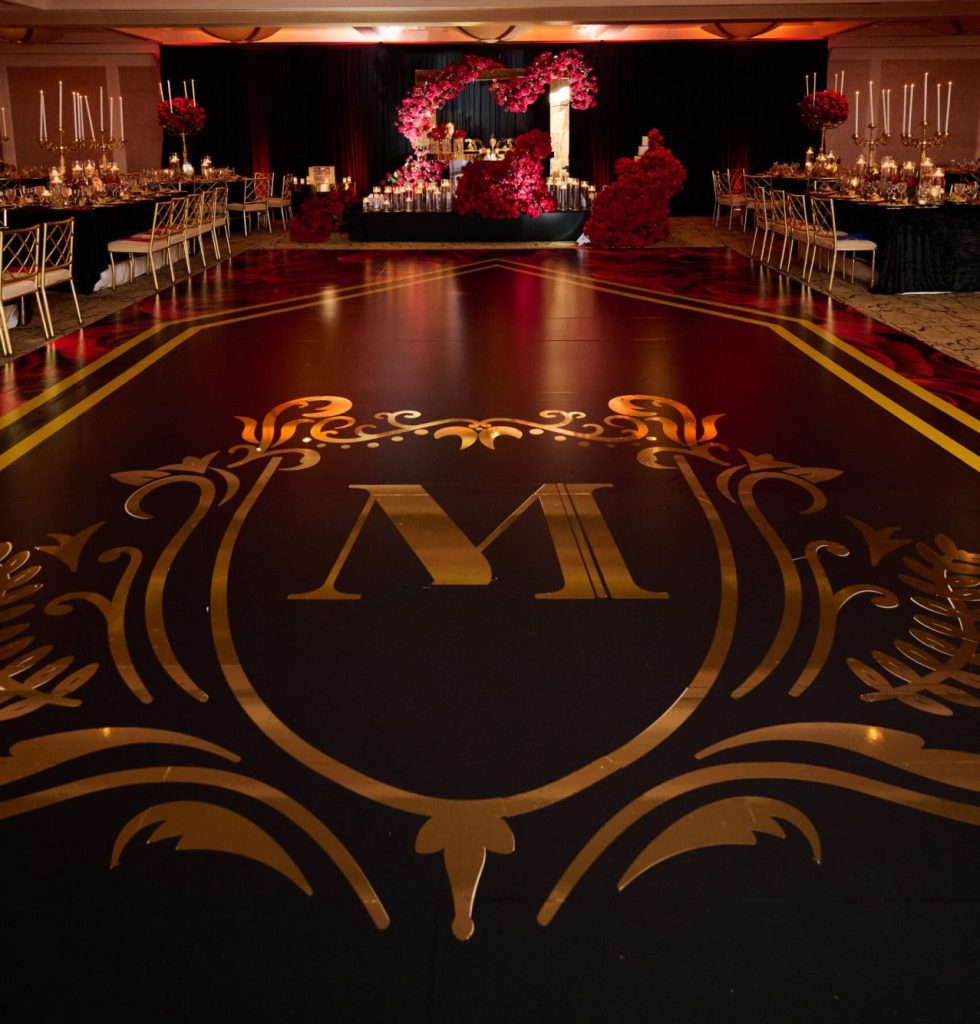 Complete your event design with a custom vinyl dance floor wrap from Ross Productions. Whether you’re hosting a luxury wedding, a corporate gala, or a themed celebration, our team can transform any dance floor into a stunning visual centerpiece. Each wrap is made to enhance your event’s look, featuring elegant monograms, clean branding, or vibrant, full-color designs that leave a lasting impression.